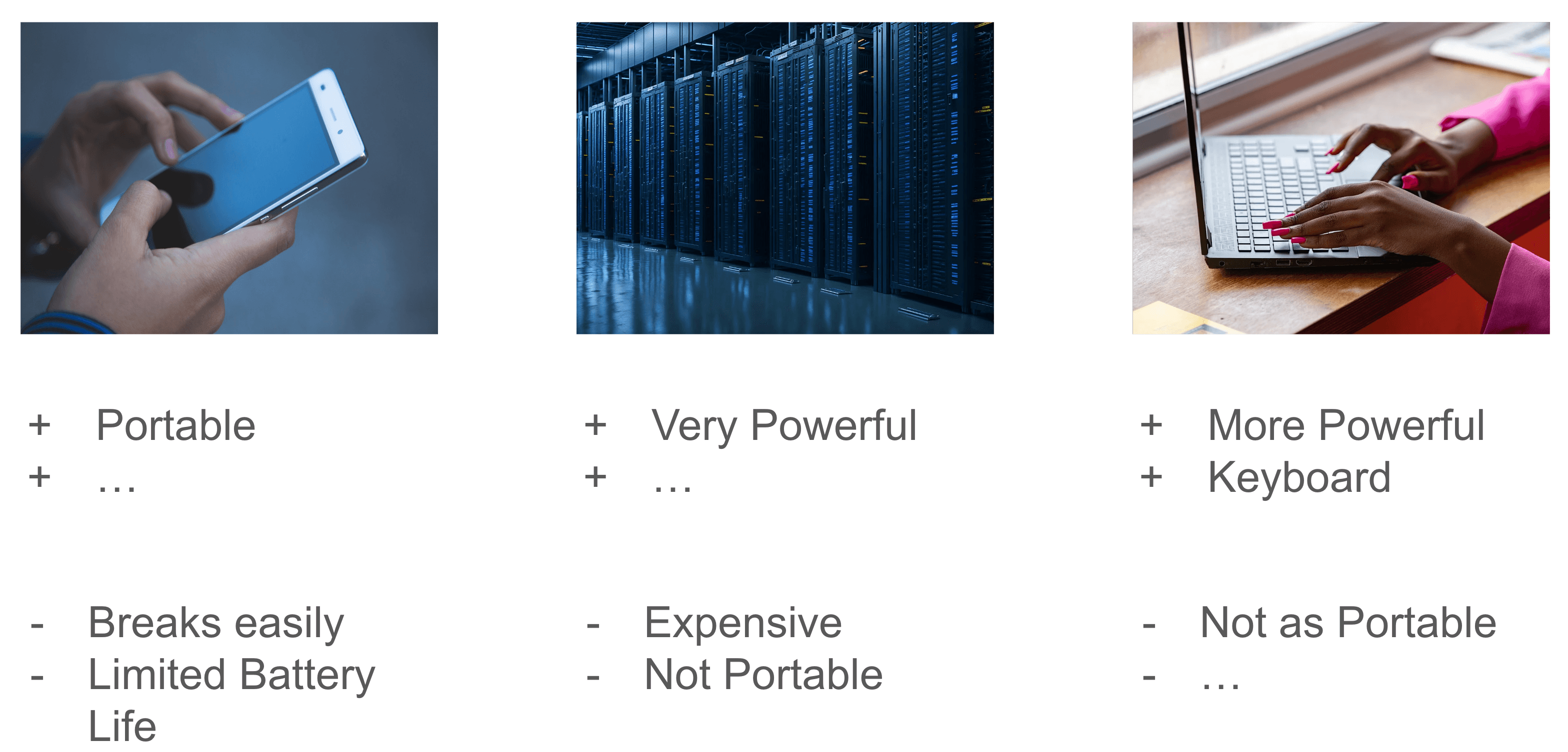 Web servers represent another type of computer, designed to handle large volumes of data and manage multiple simultaneous requests from users across the internet. They are optimized for reliability, speed, and the ability to run continuously without interruption, making them crucial for hosting websites, online services, and cloud computing platforms. While web servers excel at handling complex backend processes and large-scale operations, they are not intended for direct user interaction or tasks requiring a graphical user interface, which is where PCs and smartphones come in. Each type of computer has its strengths and weaknesses, and they often work together within the broader digital ecosystem, each performing tasks that suit their design and capabilities best.